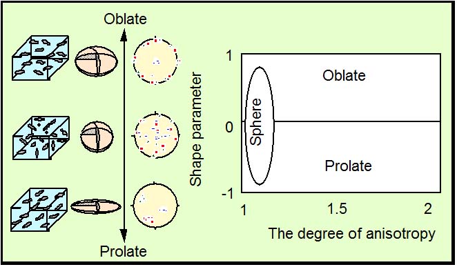 - テンソル成分から得られる異方性楕円とステレオダイアグラム(上).粒子配列と異方性の違い(下).