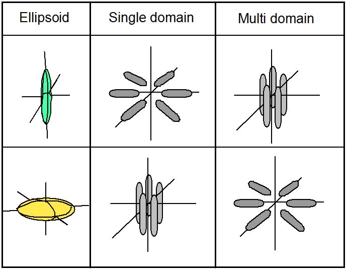 様々な磁性粒子が存在するが,その形状や配列などによって3次元的な帯磁率強度分布が異なってくる.例えば棒磁石などの磁性体ならば,その形状の長軸方向に磁化しやすく短軸方向に磁化しにくい事が想像できる.こうした磁化の許容量である帯磁率の偏りを異方性と呼ぶ.試料の3次元的な帯磁率を測定するために,結果は2階のテンソル成分として表現できる.これにより,帯磁率異方性の広がりを長軸・中軸・短軸の3成分を持つ異方性楕円として表すことが出来る (図1).