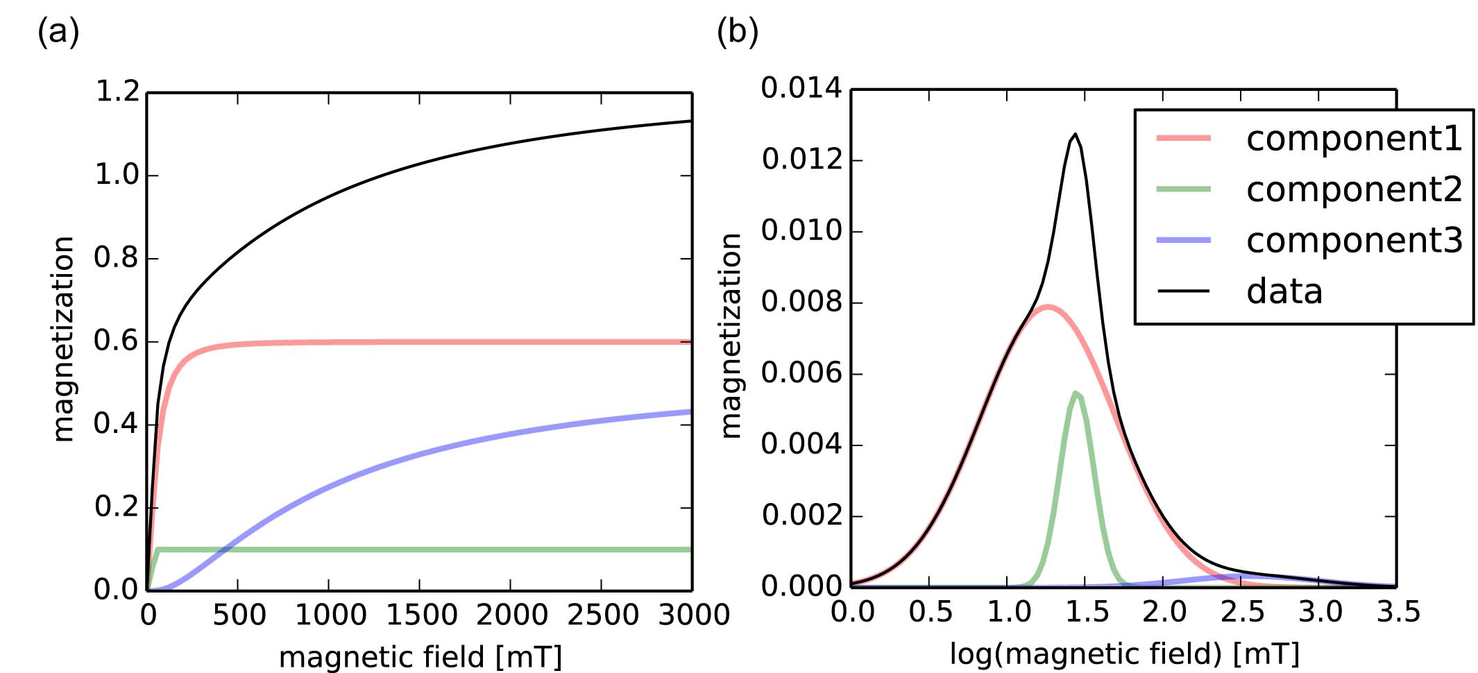 応用編概要 †基本編では、一つの試料の特徴を一つの量で表現していた。これにより似通った試料間での変動を単純に表現することができるが、試料が多成分系である限り、「なぜその量が得られるのか」には答えることができない。応用編では試料の構成を定量的に解析し、試料の磁性の起源に一層近づく方法を紹介する。 着磁曲線分解 †概要 †最初の例は残留磁化着磁曲線である。ここでは特にIRMの着磁曲線を考える。Major curveで得られるMrsは、すべての磁性鉱物粒子が印加磁場の方へ磁化した結果である。一方、磁性鉱物粒子はそれぞれ保磁力が異なっているため、直流磁場Hを徐々に増やしながら残留磁化を測定していけば、Mrsへ漸近する曲線(IRM着磁曲線)が得られる。IRM着磁曲線、特にその微分は粒子の保磁力分布を反映する。そのため、IRM着磁曲線に対し、ピーク分離のようなことを行えば、起源の異なる磁性鉱物を定量的に分離できる。この方法は特に堆積物中の磁性鉱物の変化と環境変動とを比較する際に威力を発揮している。火成岩に対する適用例は今のところまだあまり無いようである。 同様な情報はARMの着磁曲線や、後述するFORC分析でも得ることができる。IRM着磁はこれらの手法に比べ迅速に測定できることが大きな利点である。 ちなみに、こうして得られる保磁力を、メジャーループから得られる保磁力と区別して微視的保磁力 (micro coercivity) と呼ぶこともある(温度を0Kとして定義することもある)。単磁区粒子の場合はまさに粒子の保磁力ということで良いが、多磁区粒子の場合は実際には磁区状態が遷移することで磁化が変化することもあり、状態・履歴によって変化する可能性があるため微視的保磁力すらも実体のある量とは言い切れない。 実際の測定と解析 †IRM着磁曲線の取得はVSMやAGMという装置(後述)で容易に取得できる。上で述べたような解析を行うために、磁場を対数スケールで増加させていき、典型的には最大1T程度まで、100点程度で測定を行う。岩石磁気実験室に広く設置されている装置では、1試料あたりの測定時間は10分程度である。 IRM着磁曲線とmajor curveとの間の測定上重要な違いとして、IRM着磁曲線では弱磁場(数mT)の情報が重要であることと、通常正の磁場しか印加しないことがある。このため、測定装置の校正(特にゼロ点合わせ)が正確に行われているかどうか、測定前に試料が十分に消磁されているかどうか、の二点に注意を払う必要がある。 IRM着磁曲線の解析方法は複数提案されており、ソフトウェアもいくつか公開されている。状況に応じて最適なものを選択するべきである。ここでは二つ紹介する。 Robertson & France (1994)は、天然試料の分析と理論的な考察により、単一の起源の粒子集団のIRM着磁曲線は、対数正規分布の累積分布関数で近似できることを示した。これに基づき、IRM着磁曲線の分析は、模式的には図7のように行われる。まず試料のIRM着磁曲線(図7(a)の黒)を微分する。次に黒線を適当な数の正規分布曲線で近似する。ここでは、数十mTのやや広い保磁力を持つ集団(赤)、同じく数十mTの比較的分散の少ない保磁力を持つ集団(緑)、数百mTの保磁力を持つ集団(青)に分解できることがわかる。 このように目標関数の形を仮定してフィッティングを行う方法はsupervised unmixingとも呼ばれる。