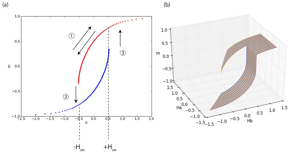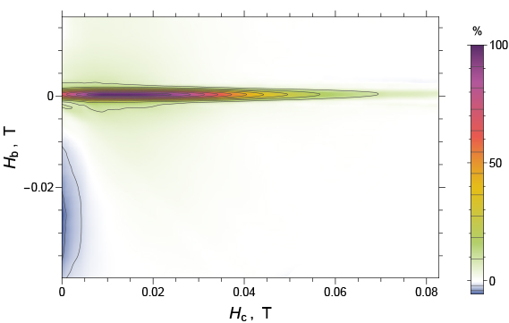 もっとも単純には,FORC分布はミクロな保磁力を示すと考えられる.図2で紹介したとおり,単一のSD粒子のヒステリシスは,特定の磁場 (switching field: Hsw) で不連続に変化(逆転)するという特徴を持つ.この場合のFORCsは図9のようになる。Ha > -Hswの場合(図の①)は滑らかに変化するが、Ha = -Hsw(図の②)およびHb = +Hsw(図の③)で磁化が不連続に変化し、その微分は発散する。実際にはHswの異なる多数の粒子を測り、測定・解析手法の制約もあるため微分の発散点はピークとして見られ、そのピークの位置はHswの分布を反映する.
