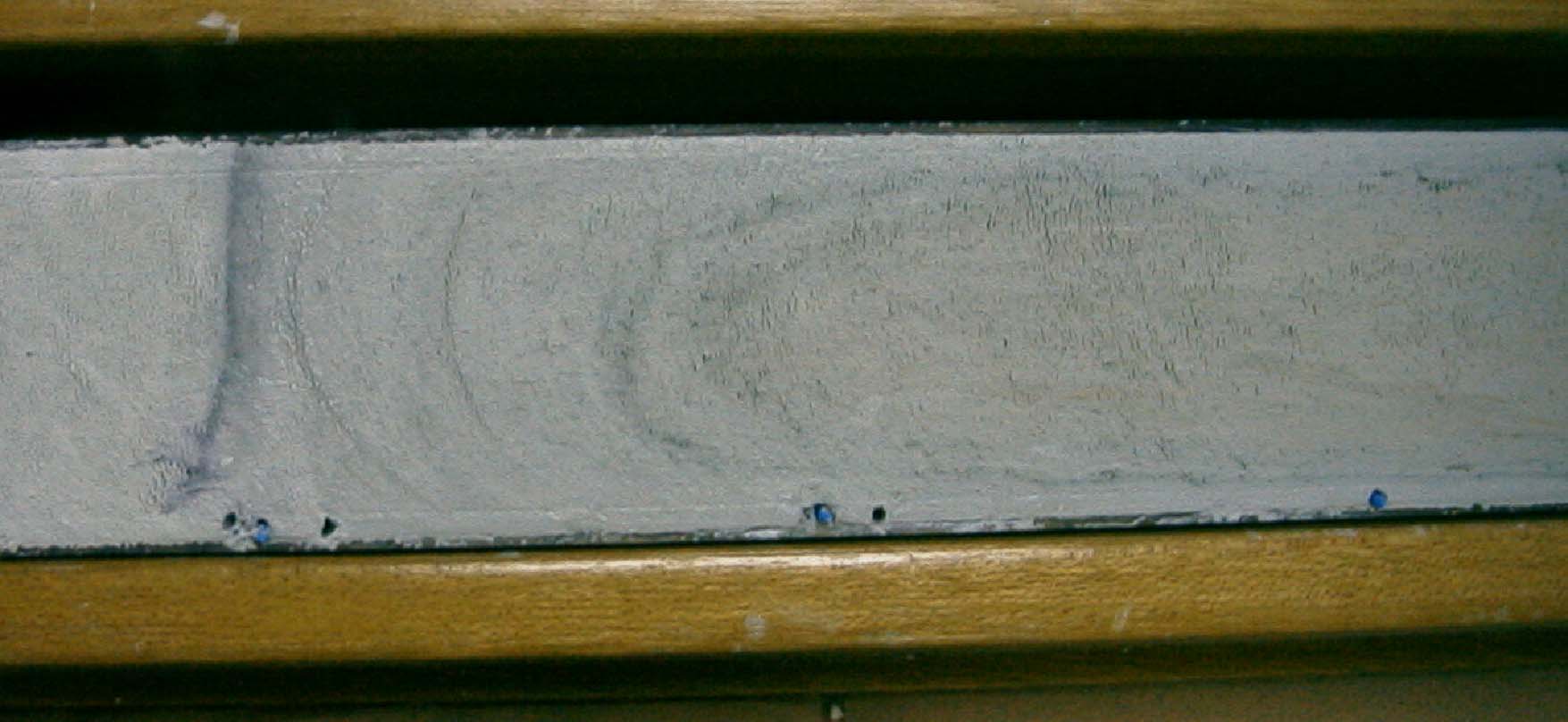 フローイン(flow-in) †フローインとは、コアキャッチャー直下の堆積物がピストンによる陰圧で吸い込まれたもので(写真2)、サンプルとしての価値はない。Suck-inと記載される場合もある。ODP, IODPのAPCに限らず、ピストン・コアラーで普遍的に起こり得る。通常のピストンコアではフローインの下に正常な堆積物が採取されることはないが、ODP/IODPのAPCでは9.5m単位のコアの途中で起きているケースもある(写真3)。鉛直方向の筋状の模様として普通は肉眼で容易に認識できるが、均質な堆積物では認識しづらいこともあるので要注意。残留磁化としては、その上下の正常な堆積物の部分とは整合的でない方位を示し、かつ強度変化が少ない場合が多い。