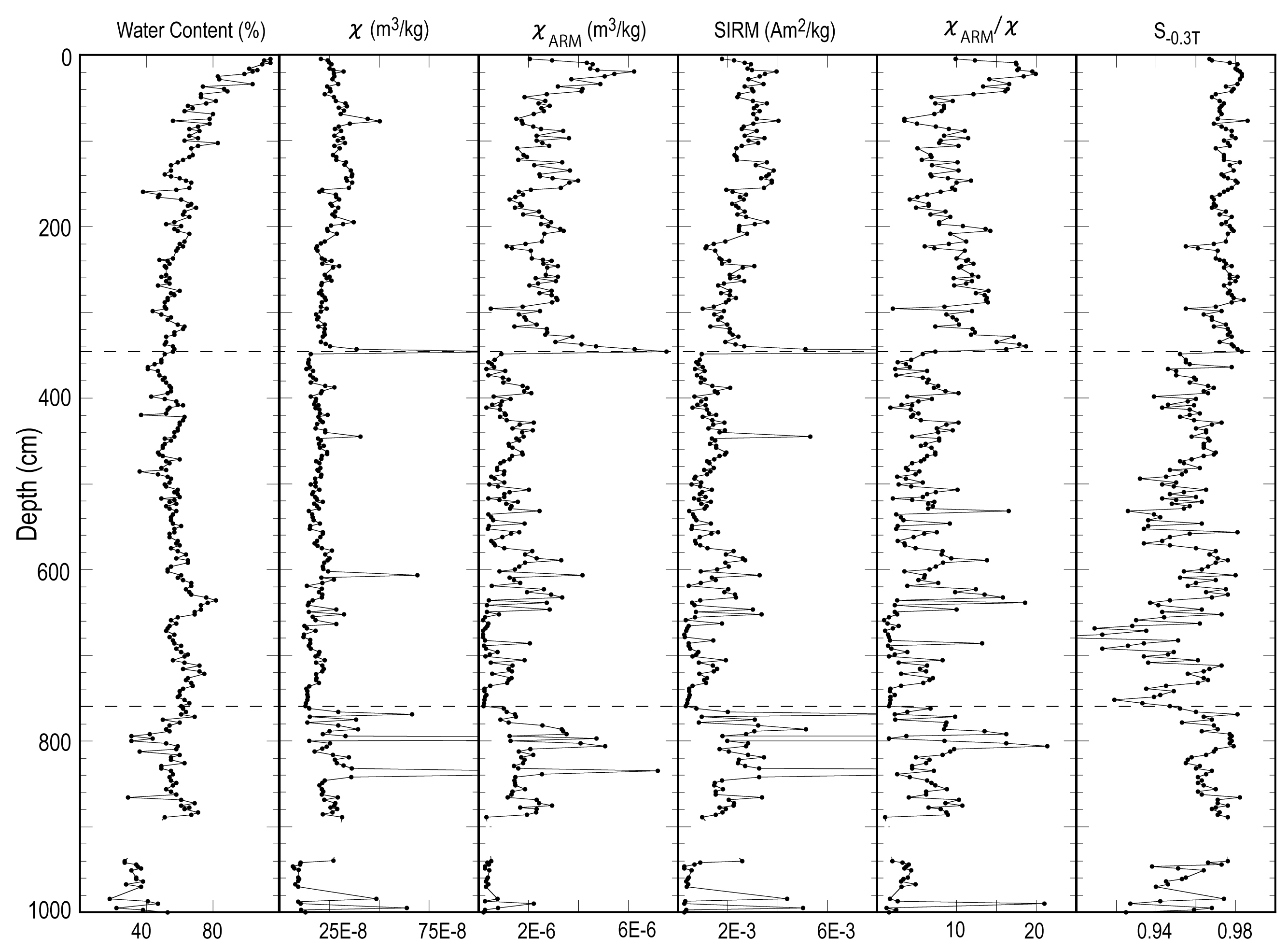 火成岩を対象とする場合には,上の図に示された関係を理解していれば大体のことは分かります.しかし,堆積物の場合はもっと複雑で,酸化物以外に硫化物(グレイガイトなど)などが含まれている可能性を常に考えてみる必要があります.また,堆積物は風化が進みやすいので,チタノマグネタイトが低温酸化されるなど,磁性鉱物の種類を複雑にしている可能性が高いのです.これ以上,個々の磁性鉱物について詳しく述べるだけの時間がありませんので,この程度にとどめたいと思います. 5. コア試料の通常の磁気測定から得られる情報 †コア試料の岩石磁気学的データは,特別な測定をしなくても,通常の古地磁気測定に付随した実験からかなりの情報が手に入ります. 5.1 自然残留磁化(NRM)の強度や安定性 †自然残留磁化の強度は,堆積物が磁化したときの地球磁場の強さと,含まれている磁性鉱物の性質が反映されています.また,残留磁化の消磁に対する挙動(安定性)は,磁性鉱物の種類や粒径に大きく関係しています.これらの情報は古地磁気測定をすると必ず得られるものですから,まずそこからできるだけ役に立つ情報を読み取りましょう.NRMの強度と堆積物の色や粒度を組み合わせて考えれば,含まれている磁性鉱物が単純なのか,それとも複雑なのかをだいたい推定できると思います. 5.2 初磁化率(low-field magnetic susceptibility) †初磁化率は,地球磁場程度の弱い磁場中(low-field)に試料を置いたときに,試料に誘導される磁化を磁場の値で割った物理量で,通常単位重量当たりの値(χ: m3/kg)か,単位質量当たりの値(κ:無名数でSIと表される場合が多い)で表されます.初磁化率は,堆積物の磁性測定ではもっともポピュラーなもので,例えばIODPの船上ではルーチンでパススルー測定されています.ですから,あまり磁気的な量というイメージではなく,色などと同じように,堆積物についての一次情報のような取り扱いを受けている印象があります. しかし,初磁化率は非常に複雑な値です.一般的には堆積物中に含まれている磁性鉱物の総量と理解されています.しかし,前節で述べたように,堆積物中には様々な起源の,様々な種類の磁性鉱物が含まれていますから,色々な磁性鉱物の混ざり方を反映しています.しかも,それぞれの量だけでなく,図2-1で示したように粒径にも強く支配されています.つまり,総合的な値なのです.測定方法は非常に簡単なのですが,単純には解釈はできない値だということをよく理解しておいてください.詳しいことは鳥居・福間(1990)などを見てください. 5.3 非履歴性残留磁化(ARM: Anhysteretic Remanent Magnetization) †ARMという残留磁化はなかなか有用な値です.詳しい理屈は小玉(1990)などで勉強してください.ごく簡単にいいますと,地球磁場程度の直流磁場を交流消磁中の試料に同時に作用させると磁化してしまいます.つまり消磁としては失敗なのですが,この操作によってARMという独立した磁化量が手に入ります.U-channel試料を用いる場合には,NRMの段階消磁が終わった後,引き続きパススルー磁力計でARMを付けて測定することができます. ARMは,安定な自然残留磁化の担い手である微小(1 μmよりずっと小さい)な磁性鉱物の量を反映する磁化だと考えられています.ですから,安定な自然残留磁化を記録している磁性鉱物の量が,時間とともにどのように変動してきたのかを知る非常に有力な情報源なのです.ただし,磁性鉱物の濃度が増えると,互いに相互作用を及ぼしだしてしまい,そのために単純に解釈できなくなってしまうことが知られています(Yamazaki and Ioka, 1997). ARMの獲得には,交流磁場と直流磁場の両方が必要です.しかも,その両方の強さに比例します.交流磁場については,多くの研究室で80〜100 mTの磁場が使われているので,ほぼ同じ条件だと考えていいでしょう.一方,直流磁場の方は様々なのですが,ARMの値を直流磁場で割ってやれば,磁化を磁場で割るわけですから,磁化率,つまりARM磁化率(χARM)が求まります.ARMの単位はAm2/kgです.磁場の方は,例えば地球磁場に程度の0.05 mT〜0.1 mTがよく使われます.単位系をそろえるために,0.1 mT → 1000/(4π) A/m という換算をしますと,ARM磁化率の単位も初磁化率と同じm3/kgとなります.磁化率ですから,同じ単位になるのは当然です.ARMそのものを使うより,ARM磁化率を使う方が獲得条件の差を考慮する必要がなくなるので便利です. なお,ARM磁化率を初磁化率で割った値,χARM/χは試料中の磁性鉱物の粒径を推定するパラメータとしてよく利用されています(King et al., 1987).磁性鉱物が純粋なマグネタイトだけがであれば,この値にもとづいて平均粒径を推定することが可能です.しかし,そういう単純な条件はめったにないでしょうから,粒径変動の傾向を見るだけのパラメータと考えた方がいいでしょう.つまり,磁性鉱物の種類が大きく変わる場合には単純に解釈できないわけです. 5.4 等温残留磁化(IRM: Isothermal Remanent Magnetization) †等温残留磁化は,温度を変えずに(通常室温)で,試料に直流磁場をかけ,その時獲得される残留磁化です.十分大きな磁場をかけれ