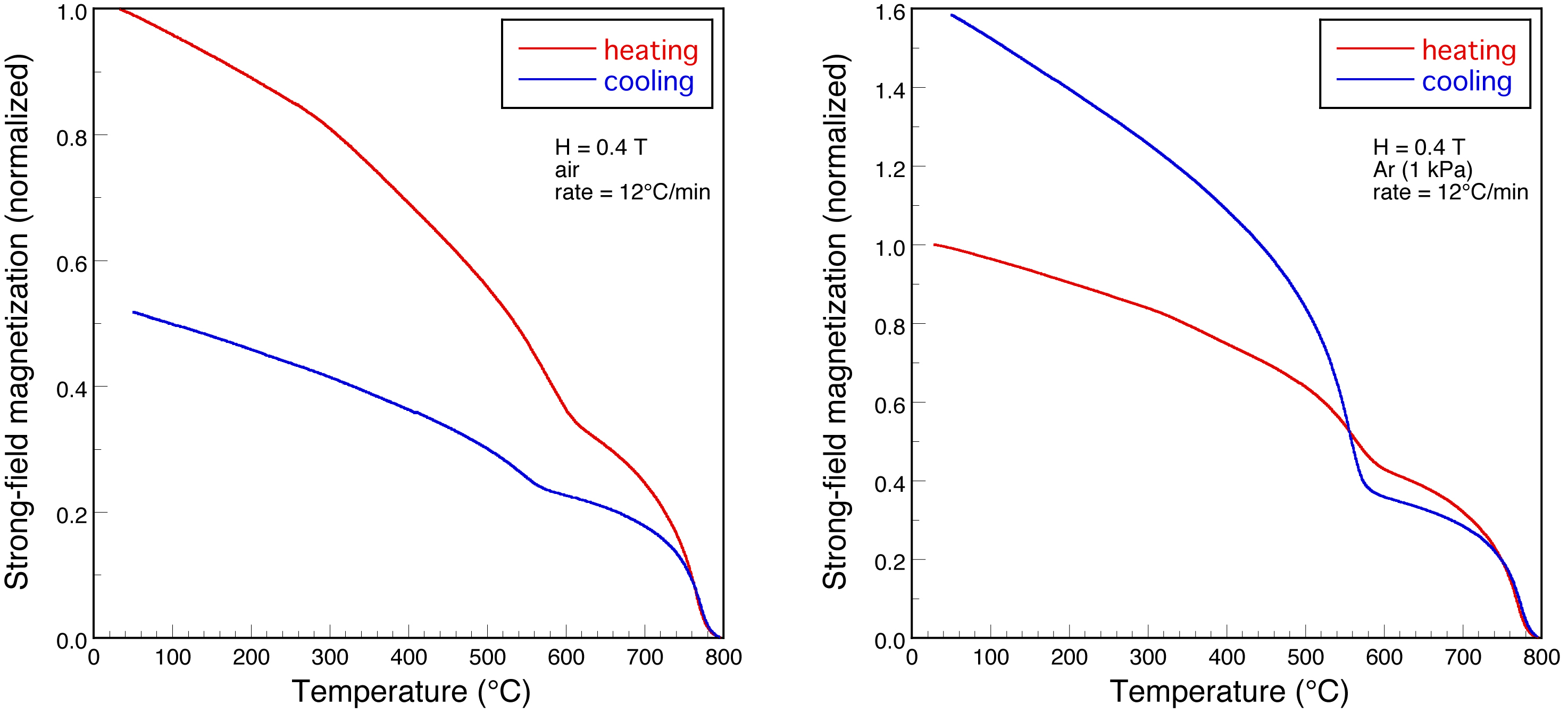 理屈通りになる場合もありますが,多くの場合は磁性鉱物が変質していたりしてるので,キュリー点だけで鉱物を決めるのは難しい場合が多いのです.また,鉄ーチタン酸化物以外の鉱物も表4-1に示すようにそれぞれのキュリー点を示します.つまり,鉱物種がわからないと,逆にキュリー点が解釈できないという矛盾したことになってしまいます.1種類のデータからだけ決められるほど,簡単なことでないのです. さらに,様々の実験条件,加熱を空気中で行うのか(酸化的),真空もしくは不活性ガス中で行うのか(非酸化的)で,加熱に伴う化学変化の様子が大きく変わります.それも,鉱物を決める際の重要な情報になります.加熱スピードによって熱磁気曲線が違って見えることもあります.また,磁場の強さによっても変わります.逆に,磁場の強さをいろいろ変化させて測定することもあります. 熱磁気分析は,単にキュリー点を決めるためだけの測定ではなく,加熱曲線と冷却曲線の差(非可逆性)から,加熱によって試料にどのような化学変化が起こったのかも推定できる,非常に総合的な測定ということができます.