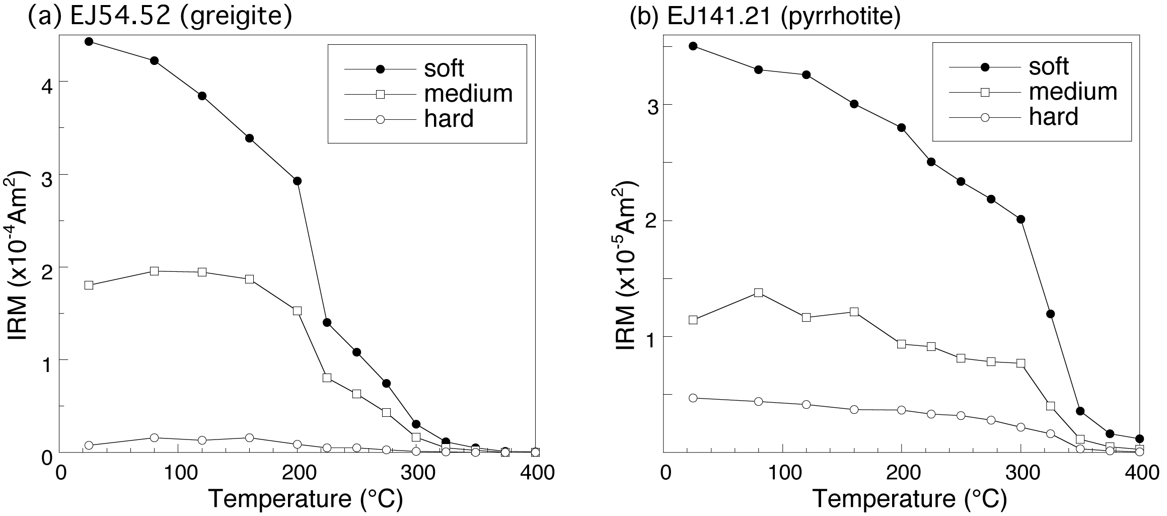 6.4 3軸直交IRM †最後に,熱磁気天秤やMPMSを使わず,スピナー磁力計だけで測定できる,簡単ですが非常に実用的な方法を1つ紹介しておきます. この方法は,互いに直交する磁化は独立しているという単純明快な原理に基づいています.通常のNRM測定用の試料を用意します.交流消磁が済んだ試料がいいでしょう.1つの試料のx方向に1.0 TのIRMを付けます.続いてy方向に0.4 T程度のIRMを付けます.このとき,x方向には1.0 Tから0.4 Tの間の保磁力に対応したIRM(hard)が残されます.さらに,z方向に0.1 TのIRMをつけますと,y方向には0.4 Tから0.1 Tの保磁力に対応したIRM(medium)が残され,z方向には0.1 T以下の保磁力のIRM(soft)が残ります.これを測定してx,y,zの3軸の磁化を求めます.これだけではおもしろくないので,この試料を段階熱消磁します.そうしますと,3つの保磁力成分の熱消磁が1つの試料で同時にできるのです.この方法を提案したのはLowrie (1996) です.単純ですが,磁性というものの本質をよく分かっていないと考えつかない方法だと思います.