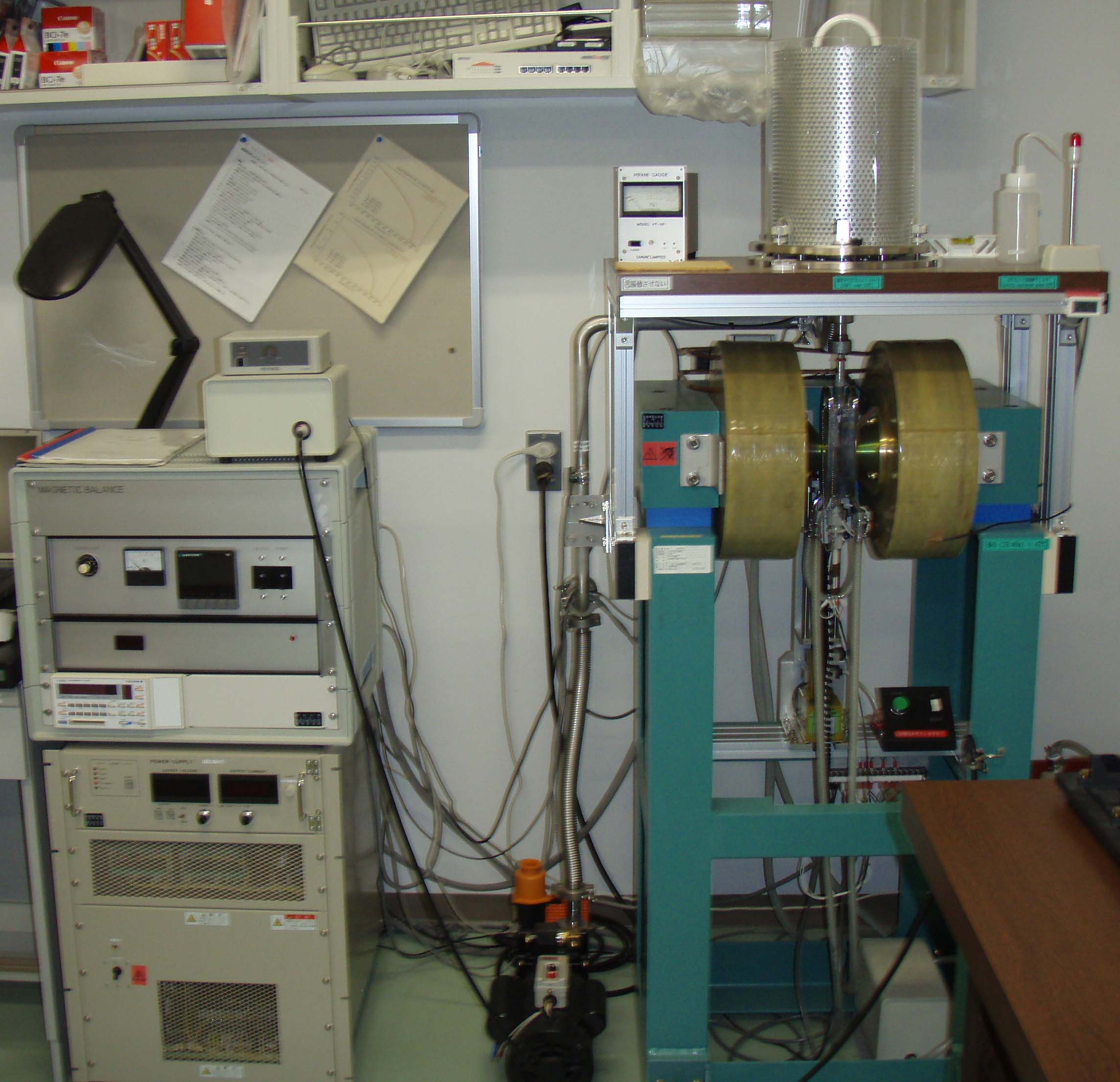 磁気天秤 †概要 †磁気天秤は,基本的には電磁石と電気炉を組み合わせた系に「天秤」もしくは「振り子」の機構を付け加えたもので,磁性体に働く力を計測することによって磁化を測定する.試料の温度と印可磁場を制御できるため,温度-磁化曲線の測定が可能で,強磁性試料のキュリー温度を決定することができる.試料空間を工夫すれば,真空雰囲気やガス雰囲気で試料を加熱/冷却することも可能であり,加熱に対する可逆/不可逆性の検討をすることもできる. 高知コアセンターの古地磁気・岩石磁気実験室に設置されている磁気天秤は,(株)夏原技研製の NMB-89 という型式の装置である(図1).2010年時点で国内に同型機が2台存在する(同志社大・信州大).100 mg 程度以下の粉末状試料あるいは岩石片を試料としてセット可能で,室温~700 ℃までの温度制御と0~+0.8 Tまでの外部磁場の制御が可能である.雰囲気制御は,大気圧~10 Pa 程度までの低・中真空域と,ガス置換(Ar/He)での測定が可能である.