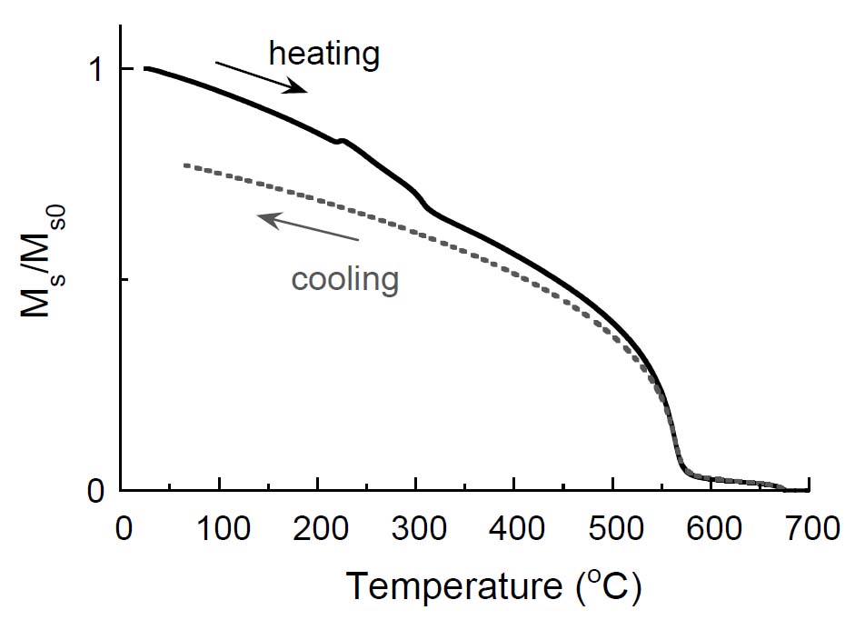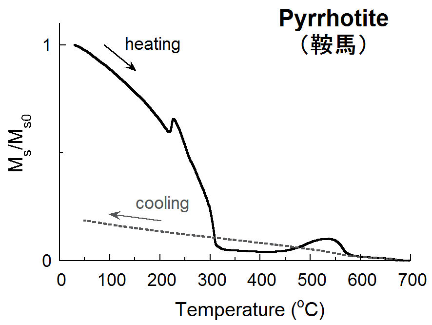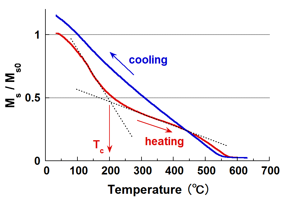 温度-磁化曲線の測定: 熱磁気分析 †試料を一定のレートで加熱・冷却し,磁化の温度変化を求める.目的によって加熱・冷却レートはまちまちであるが,5~15℃/分 の範囲で行う場合が多い.測定は,空気中/真空中/不活性ガス中(Ar, He)のいずれかの雰囲気下で行う. 測定結果としては,図6のような磁化温度曲線(Js-T曲線)が得られる.磁気的変化(キュリー温度Tc, 磁気的相変態点),加熱による鉱物の化学変化(結晶構造の変化,酸化・還元反応(強磁性鉱物の生成・消失))などに着目し,含有磁性鉱物の推定を行う.