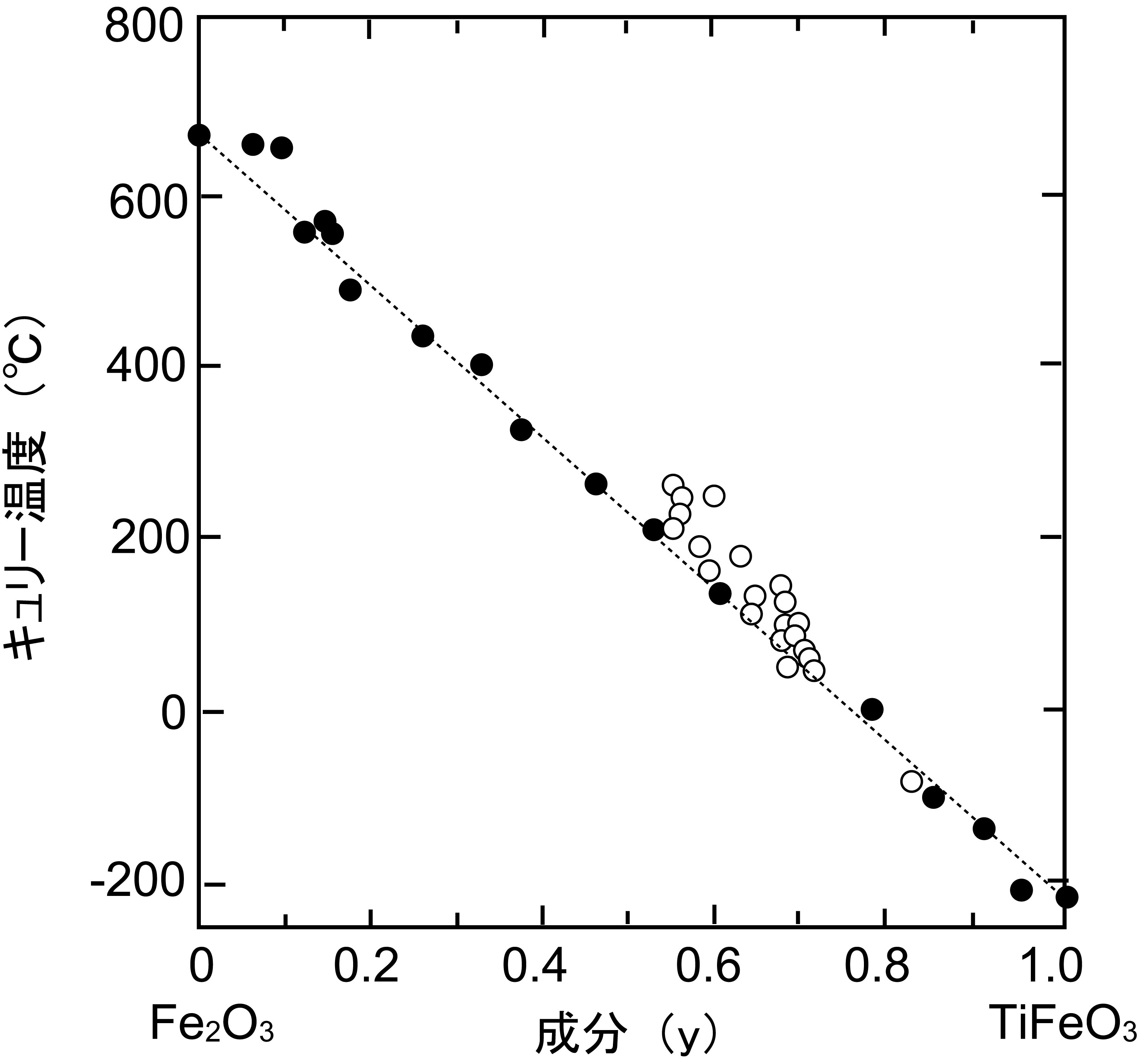 ヘマタイト(Fe2O3)と常磁性のイルメナイト(FeTiO3)は固溶体をつくり,多くの場合はチタノヘマタイト(Fe2-yTiyO3)として産出する.文献・研究者によっては,この固溶体を「イルメノヘマタイト」「ヘモイルメナイト」と呼ぶ場合もある.固溶体比 y とキュリー温度の間には図13のような関係がある.