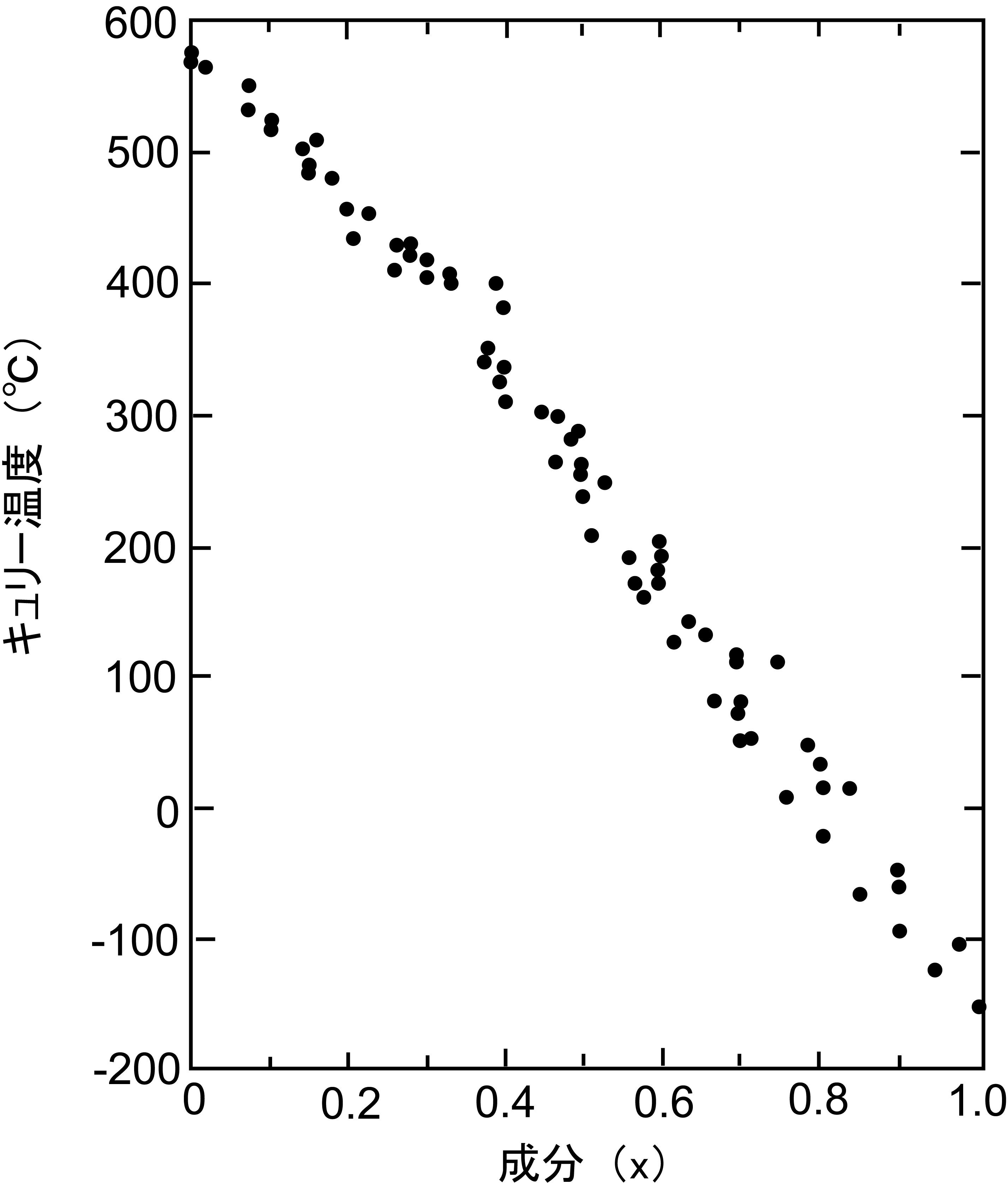 陸上の火山岩の場合,マグネタイトが含まれることは稀で,ウルボスピネル(Fe2TiO4)とマグネタイト(Fe3O4)の固溶体であるチタノマグネタイト(Fe3-xTixO4)が含まれることが多い.固溶体比 x とキューリー温度の間には図11のような関係がある.