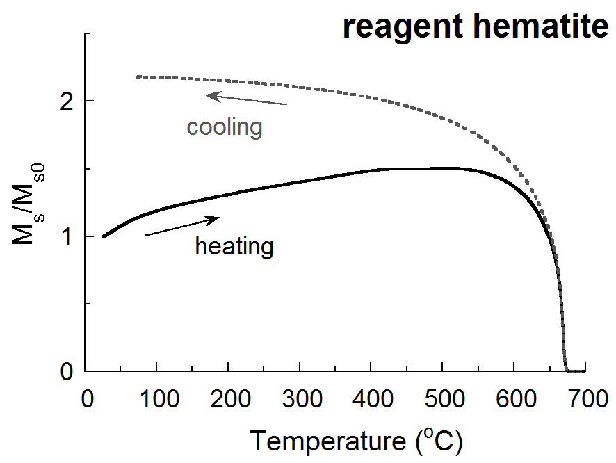 陸上の火山岩では,形成時初期に高温状態(約400~500℃以上)で酸化を受け(高温酸化),x ≦ 0.6 のチタノマグネタイトが含まれることが多い.一方,海底玄武岩は形成時に急冷され高温酸化を受けないため,固溶体組成 x = 0.6 のチタノマグネタイトが含まれることが多い.室温における x = 0.6 のチタノマグネタイトの自発磁化はマグネタイトの約1/4である. ヘマタイトおよびチタノヘマタイト †ヘマタイト(Fe2O3)のキュリー温度は約680℃である(図12).ただし寄生強磁性であるため,自発磁化はマグネタイトの約1/200と非常に弱く,試料中にマグネタイトなどと共存する場合は検出に注意を要する.