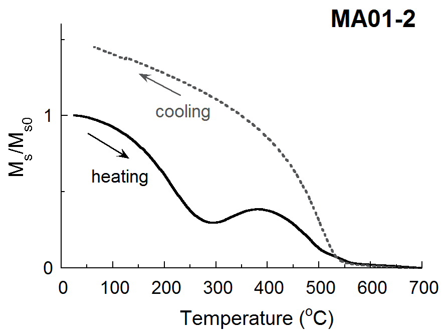 y ~ 0.6 のチタノヘマタイトは「自己反転熱残留磁化」を獲得するため,注意が必要である.火山軽石などによく見られる. マグヘマイトおよびチタノマグヘマイト †マグネタイトおよびチタノマグネタイトが低温(約200℃以下)で長期間酸化的環境にさらされると,鉱物の表面付近から Fe2+ が拡散して格子欠陥となり,マグヘマイト(γFe2O3)およびチタノマグヘマイト(γFe3-xTixO4)が生成する(低温酸化).いずれの鉱物も加熱に対して不安定であるため,空気中および真空中加熱で分解してマグネタイトおよびチタノマグネタイトとなり,不可逆なJs-T曲線が得られる(図14).キュリー温度は正確に求めることができない.実際の地質試料中では,マグネタイトおよびチタノマグネタイトと共存している場合が多い(「酸化被膜」というイメージ).