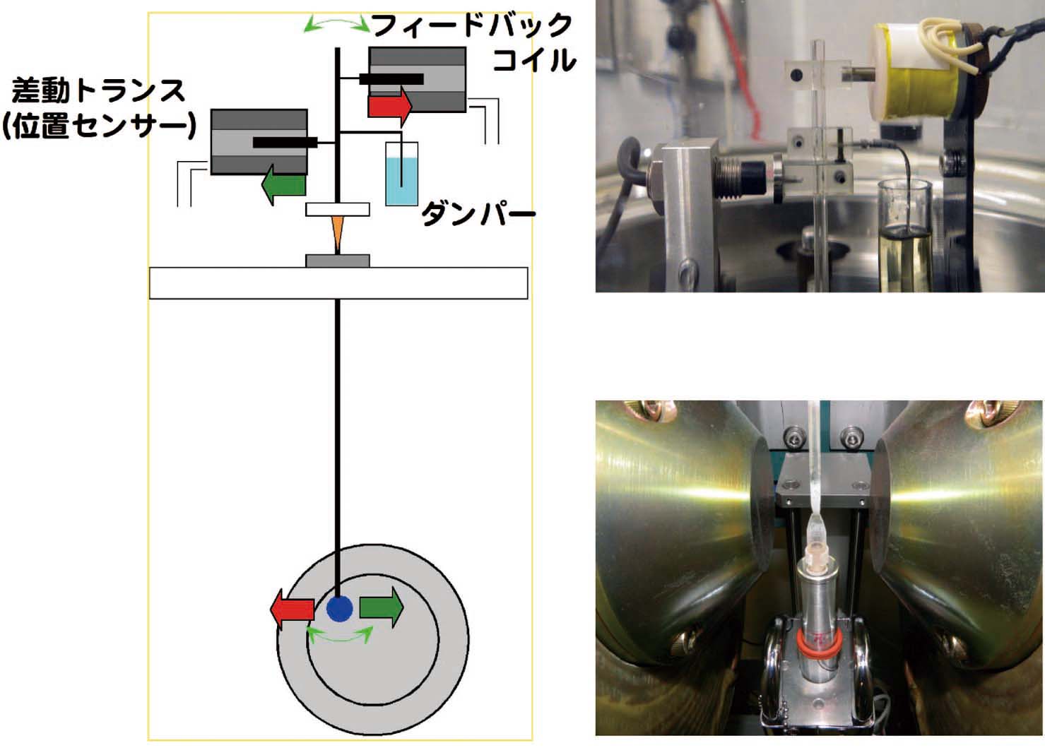 高知コアセンターの磁気天秤は「振り子」式である.磁気振り子の振れに対して,それを引き戻すようにフィードバックコイルに電流を流し,試料の位置がゼロ位置に保たれるようになっている(ゼロ点法).したがって,フィードバックコイルの電流値が,試料の磁気モーメントの強さに比例することになる.制御が振動的になることを抑えるため,ダンパー(オイルダンパー)が組み込まれている.これらの制御を実現するため,天秤の機構は図4のようになっている.