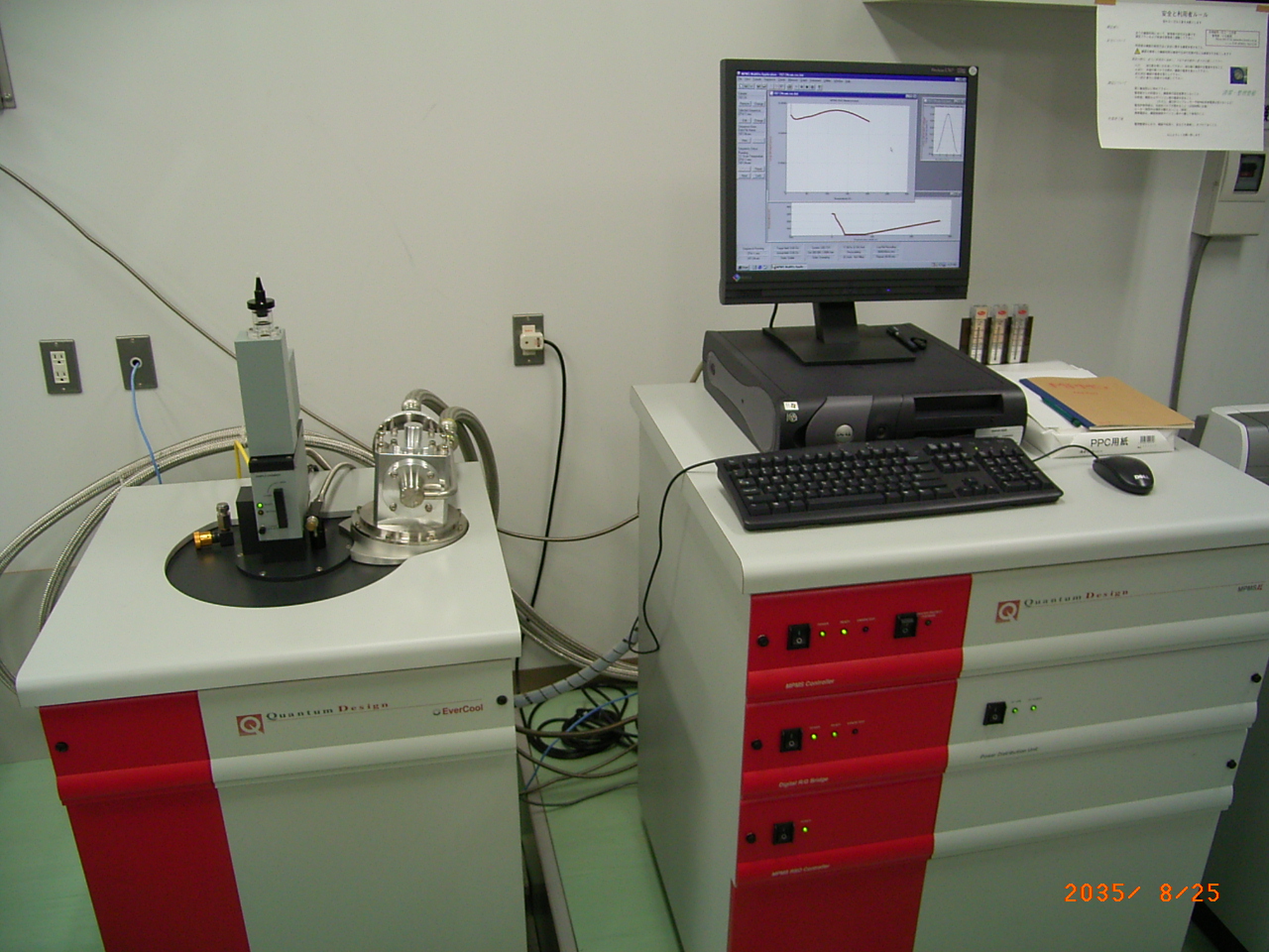 2.MPMS †低温磁気測定は,VSMや熱磁気天秤などいろいろな装置を用いて行うことができますが,一般的にいって必ずしも簡単な測定ではありません.とくに液体窒素の沸点(77 K)以下の温度領域での測定はかなりたいへんです.しかし,15年以上前から米国カンタムデザイン社のMPMS (Magnetic Property Measurement System)という装置が普及しだし,誰でも簡単に測定ができるようなりました.現在国内の関係研究室では,高知コアセンター(KCC)以外に,産業技術総合研究所(AIST)の地質情報研究部門,JAMSTEC(横須賀),富山大,京大,同志社大,岡山理科大などにあります. MPMSという装置を簡単に説明しますと,液体ヘリウムで超伝導磁石とSQUID素子を冷やしながら,試料の温度や磁場を自由に変えて,しかも高感度で磁性測定ができる万能型の装置です.SQUID素子はU-channelの残留磁化を測定する磁力計でも使用されている,きわめて高感度で磁束を測定できる素子です.しかし,MPMSでは試料の自然残留磁化を測定するのではなく,超伝導磁石が発生する最大5ないし7テスラという強力な磁場を試料に作用させて測定します.さらに,試料がおかれている空間は,液体ヘリウムから蒸発してくるヘリウムガスを加熱したり,あるいは減圧したりすることで,1.9 Kから400 Kの範囲で自由に温度を変えることができます.つまり,磁場と温度を自由に変えながら,試料のもっている微弱な磁化をSQUID素子によって検出するわけです. 数テスラという強磁場の中で,高感度のSQUID素子を動作させることが技術的にはもっとも難しい部分で,カンタムデザイン社はこれに成功して,現在では独占的地位を確立しています.それ以外に,温度変化も最速10 K/minと高速であること,さまざまなオプションが選べる(交流磁化率,異方性測定,高温測定など)などの特徴があります.なお,装置全体は高透磁率のミューメタルでシールドされています.これは,コアセンターにある他の実験装置類と似ていますが,シールドの目的は超伝導磁石が発生する大きな磁場を実験装置の外に漏らさないためで,他の装置とは正反対の役割を果たしています. なお,古地磁気関係者の間では,SQUIDといえばパススルー測定などに用いている2G社の残留磁化測定装置(Superconducting Rock Magnetometer)を指しますが,他の一般的な磁性測定の分野では,MPMSか類似の装置をさすことが多いので,混同しないように注意が必要です.