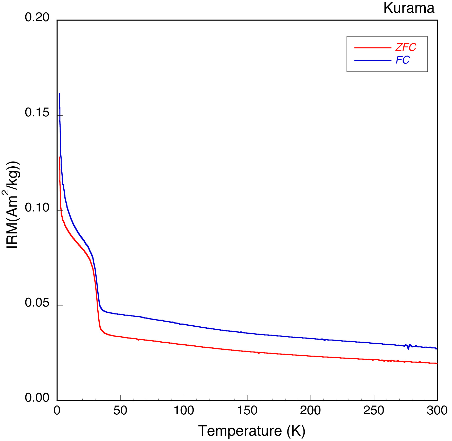 なお,MPMSは非常に高感度ですから,試料を作成するときには,磁気的なコンタミネーションに特に注意してください.道具や手を事前にきれいにし,とくに金属製品の使用は注意してください.ナイフやハサミなどの鉄製品はもちろんのこと,ステンレス製器具も使用しないほうがいいでしょう.チタンかセラミック製の道具を使いましょう. 4.測定 †MPMSの使い方はかなり簡単ですが,それなりに憶えなければいけない手順があります・実際にはマニュアルを見ながら操作してください.以下では重要なポイントだけ示すことにします. 4.1 試料の出し入れは,必ず温度を300 Kにしてから行ってください.装置としては100 K以上で可能になっていますが,トラブルの原因となりますから,300 Kでしてください.なお,ハード的な操作は試料の出し入れだけで,他の操作はすべてパソコンからになります. 4.2 新しい試料をセットしたら,サンプル空間のパージ(排気した後ヘリウムガスで置換する操作)を常温で少なくとも4回は行います.これは水蒸気や酸素の混入を防ぐためです. 低温でパージしても凍り付いてしまうので効果ありません. 4.3 試料を正しく測定位置にセットする(センタリング)には磁場が必要ですが,できるだけ低い磁場(1 mT程度)で行う方がいいです.磁場が低くてセンタリングがやりにくいときには,少しずつ磁場を増やしてみてください.これは,後述するように300 Kでの熱残留磁化(TRM)獲得をできるだけ小さくするためです. 4.4 測定はシーケンス(測定プログラム)によって自動的に行われます.シーケンスを作るためにはプログラム言語などは必要ありません.キーボードからの操作が自動的に記録されてシーケンスが作られます.最初のうちは,だれか慣れた人が作ったシーケンスをコピーして使うのがいいでしょう.1つ1つの操作の意味が分かってきたら,自分なりに改造していくのは簡単です. 4.5 残留磁化を測定するためには,試料位置の磁場をゼロにする必要があります.磁場があれば誘導磁化(あるいは磁化率)を測定することになってしまいます.超伝導マグネットは永久電流が流れているので,常にいくらか磁場が発生しています.この点が普通の電磁石と大きく違う点です.そのため,コイルの一部の温度を上げて常伝導状態にして,永久電流を熱に変えて逃がす必要があります.このための操作をmagnet resetといいます.magnet resetをしないと残留磁化は測定できません. 4.6 データは自分のフォルダーを作って,そこに保存します.これをちゃんとしておかないと,データが行方不明になったり,他人のデータを上書きしたりしてしまいます. 4.7 測定中は,装置の動作を記録するために記録(ログ)を自動的にとるようにしてください.ログが残っていれば,トラブルが起こった場合,なにが起こったのかを知ることができます.MPMSの測定は数時間以上かかりますから,ずっと見ているわけにいきません.そのためログをとることが是非必要です. 5.測定モード †私たちがMPMSでよく行う測定は,低温(10 K前後)で獲得させたIRM(等温残留磁化)の温度変化を300 Kまで測定する(IRMの熱消磁)方法です.これは,鉱物ごとの磁気的相変態を検出するのに便利な方法です.300 Kから下げていっても同じことなのですが,MPMSは温度を上げていく方が動作がスムーズです. IRMの測定には2つの重要なオプションがあります.それは,室温から低温までの下げ方の違いです.通常は室温から10 Kぐらいまで下げるときには,無磁場中で下げていきます.これをZFC (Zero-Field Cooling)と呼んでいます.これが普通のモードです. これ以外に,室温から下げるときに1 T程度の強磁場中で下げることがあります.これはFC(Field Cooling)と呼ばれています.同一の試料についてZFCを測定したのち,引き続いてFC測定をすることがあります.時間は倍かかりますが,後で述べるように有益な情報がえられることがあります.FCの意味はいろいろありますが,分かりやすい考え方として300 Kで試料に与えたTRMであるという解釈があります.300 Kといえども,10 Kに比べれば非常に高温ですから,当然TRMが試料につきます.ですから,低温から300 Kに戻すときには,このTRMも消磁されたり,相変態にともなって現れたりします.しかし,TRMが関係した変化では理解できない現象も多く,まだ未解決の部分がたくさんあります.